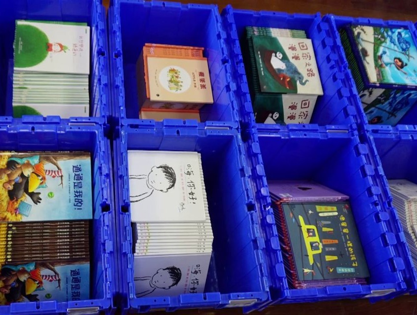 同一本書,依照班級人數裝成一整箱,一個書庫大約準備一百箱,涵蓋不同年級。